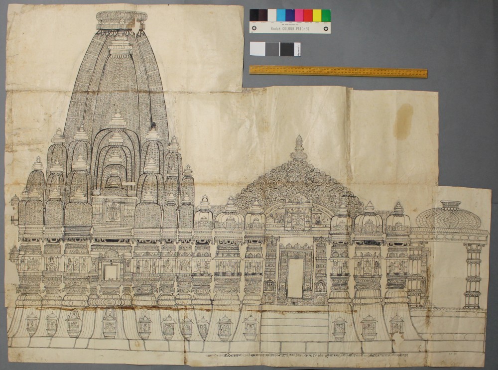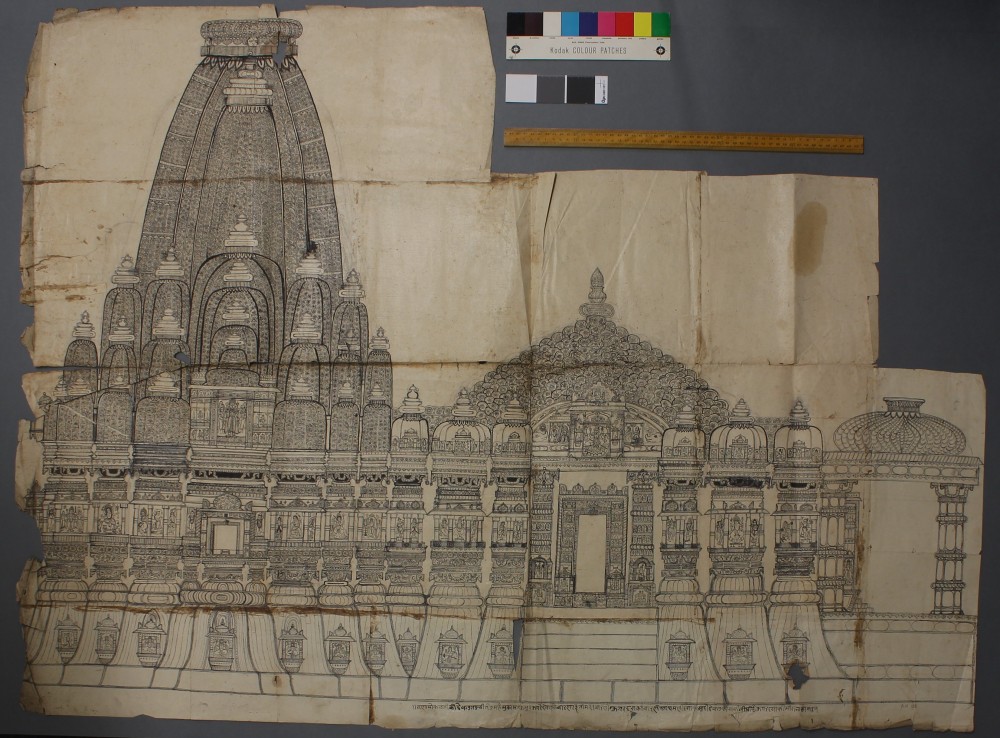 The conservators chose to work with a wide range of material, reflecting the richness and diversity of the RAS collections. For her project, Rebecca Snow restored a drawing from the Tod Collection, titled “Northern elevation of the Temple of Rana Mokal, Chitor” (RAS 037.174), dating to around 1820. This ink drawing was made across eight sheets of Indian paper which had been joined together by adhesive. The drawing exhibited many tears, losses, folds, and creases, as well as historic repairs using a crusty glue, which caused discoloration and staining. Some sections were beginning to come apart and there was a lot of surface dirt. The object’s large size also posed a challenge as far as storage was concerned, and historically it had been stored in a folded position, as it was too big for even our largest shelves. All in all, the piece suffered from a number of problems which not only reduced its aesthetic appeal, but also posed a risk to its long-term stability and survival.