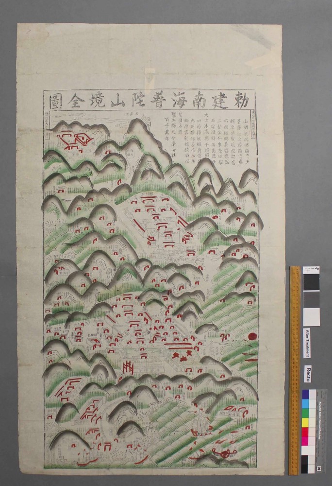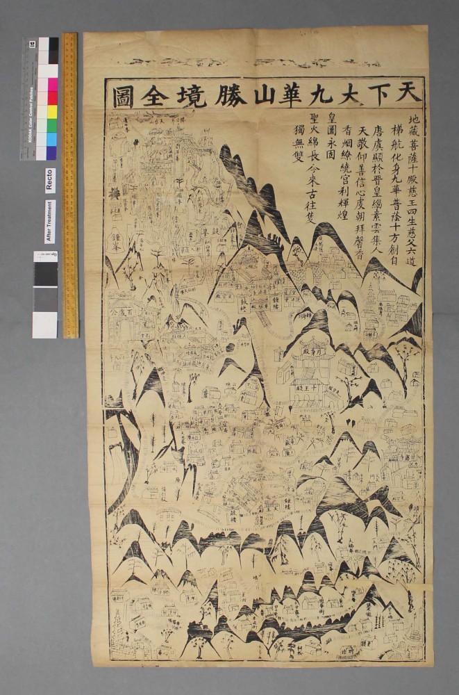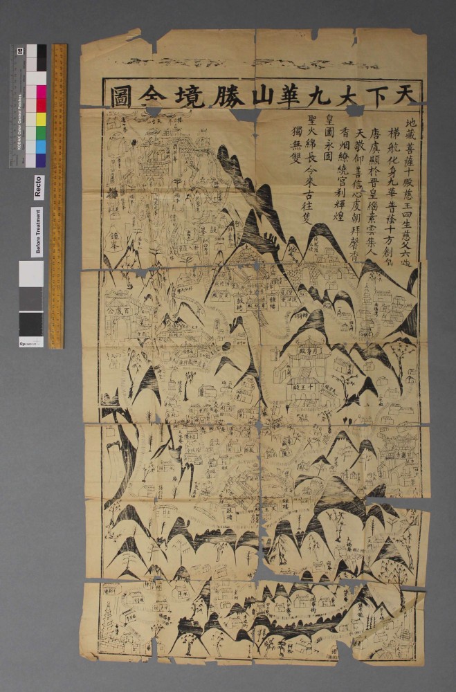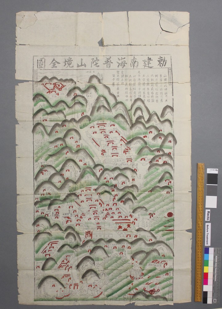 Joey Shuker’s project focused on the conservation of maps of two of the great mountains of China, Mount Hua and Mount Putuo. The woodblock print maps (one featuring a coloured wash) were printed on very thin and brittle Chinese paper, and over time had become heavily torn and creased, and were very difficult to handle without causing additional damage. Joey had to carefully examine the fragile paper and the ink to determine what sort of treatments would be safe to use.
