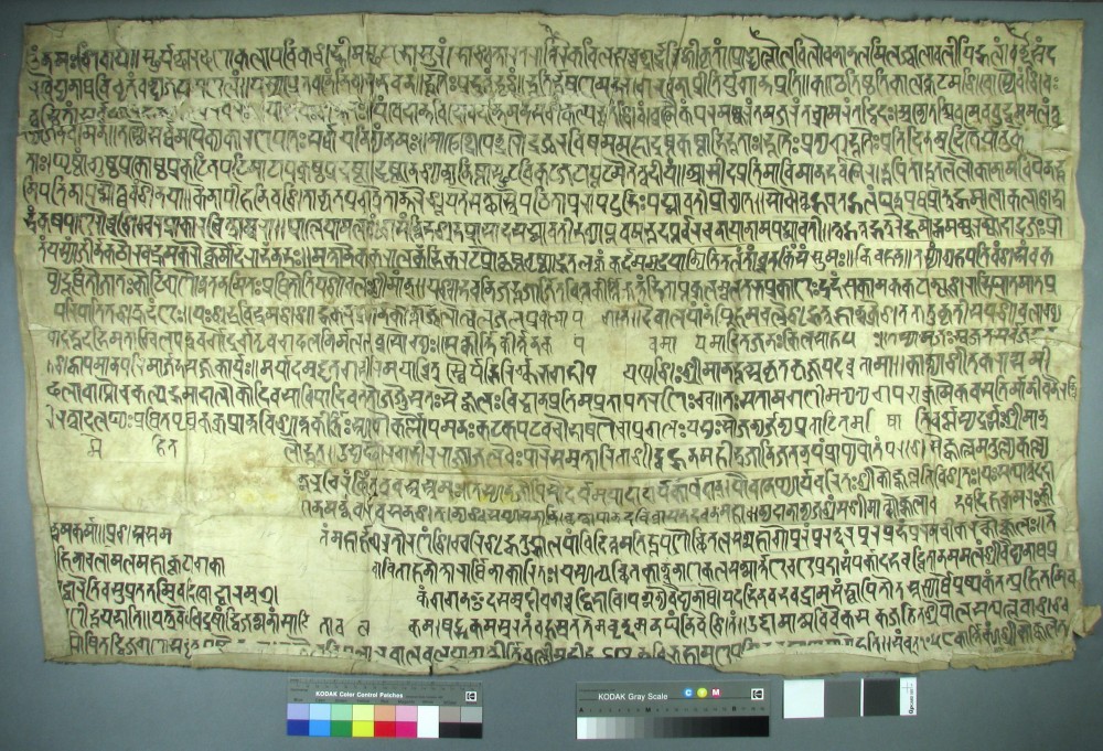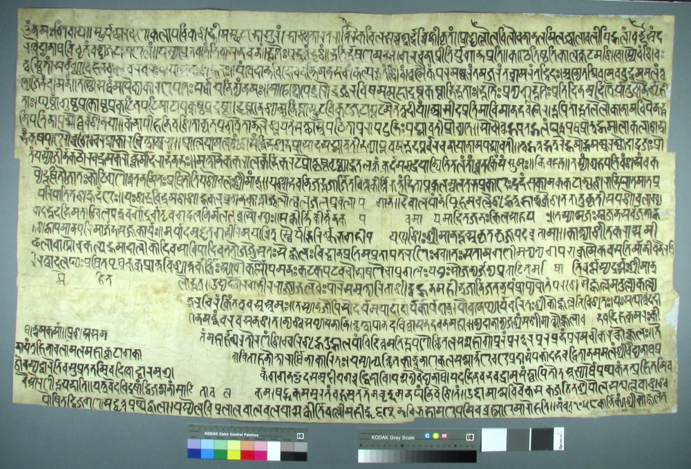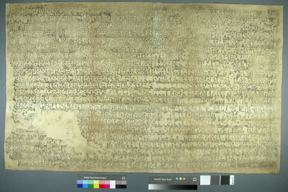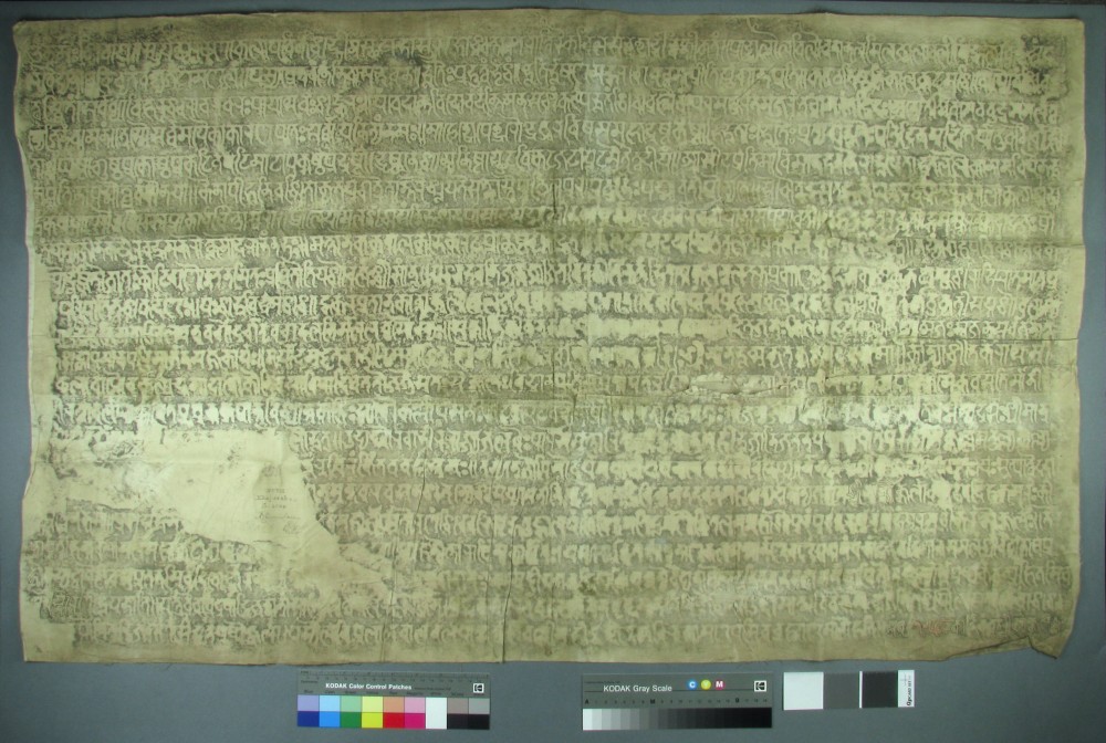 Laurent Cruveillier conserved a nineteenth century ink rubbing and inked squeeze on paper (both the negative impression in white on black, and the positive impression in black on white). This depicts a stone inscription of Kokkala of the year 1058, Vikram Era (1000-1001 CE), completed under the authority of Sir Alexander Cunningham (1814-1893), who founded the Archaeological Survey of India. The two large sheets were highly unstable, weak and brittle, comprising several pieces of thin acidic paper which had been adhered together; and the positive impression showed extensive evidence of historic mould infestation and degradation. The sheets were also dirty and discoloured, and were creased from having been stored in a folded position.