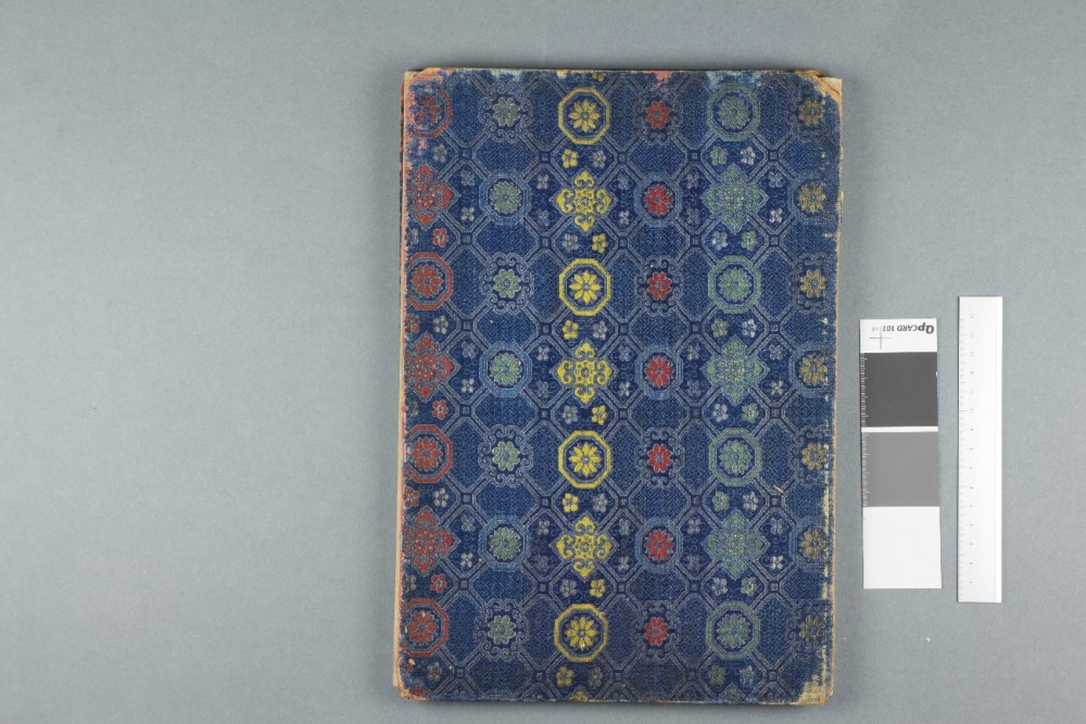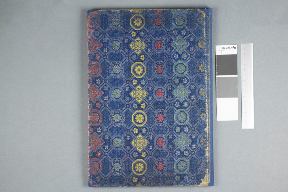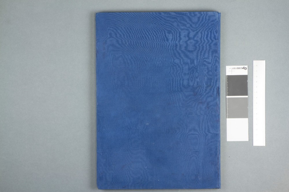 Isana removed the surface dirt with a hake brush and chemical sponge, and repaired tears with Japanese paper. The remaining boards were consolidated, and the corners infilled to solidify them and provide better protection for the text block. The missing endbands were resewn using orange and light green silk thread to recreate some of the original look of the bindings. As well as reattaching the existing boards, a new back board for volume two was created with undyed and unbleached Chinese silk, which Isana dyed to match the original blue. Using special techniques, a board was created with the same thickness as the original, and with a similarly light and soft feel. Finally, Isana created a Chinese style four-sided case to house the volumes, providing extra protection as well as easy access to reduce wear and tear from handling in future.