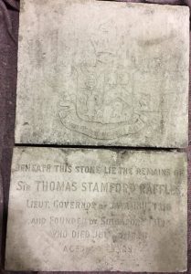Both Sir Stamford and Lady Raffles were generous donors but recently we have gained a more unusual item connected with Sir Stamford Raffles. Earlier this year, we were contacted by a stonemason to say that he had the old gravestone of Sir Stamford Raffles in his garage. He had been commissioned to create a new stone in 1999 and had stored the old one, not sure what to do with it. However, as he was about to move, he inquired whether we would accept it. So, we are now in possession of Raffles’ original gravestone. It is difficult to see due to erosion, but on this gravestone it was wrongly recorded that Raffles had reached 45 years. This has been corrected on the new one.