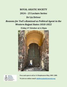 Having virtually moved from Singapore to Pakistan, today, Friday 4 October, Dr Liz Driver will take us to India in her lecture, Reasons for Tod’s dismissal as Political Agent in the Western Rajput States 1818-1822. The talk will aim to re-assess Tod’s role as Political Agent in the Western Rajput States for the brief period 1818-1822 and to determine what went wrong. It will address Tod’s visit to Maharaja Man Singh in Jodhpur but the focus will be on the events in Kotah in 1820-21. It will draw on Tod’s own account in the Annals and Antiquities of Rajasthan and on the, often vituperative, correspondence between Tod and his immediate superior, Sir David Ochterlony, and with the government in Calcutta. You can attend in person at the Society’s premises or online by contacting Matty Bradley on mb@royalasiaticsociety.org.