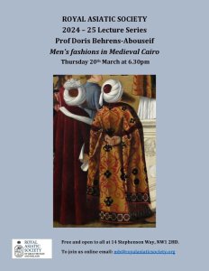Next week, on Thursday 20th March, 6.30 pm, Professor Doris Behrens-Abouseif, former Nasser D Khalili professor at SOAS, will lecture on ‘Men’s fashions in Medieval Cairo’. While dress code in medieval societies was largely defined by religious, political, and social rules, personal preferences could still play a significant role in shaping dress culture. Focussing on Mamluk Cairo, this lecture will document the involvement of sultans and emirs in the design of uniforms and ceremonial outfits to convey their political image, while at the same time, in pursuit of a refined lifestyle, individuals of the elite created fashions and designs that were named to them. Commoners created fashions as well, but they remained mostly nameless. Combined with social and economic developments over more than two and a half centuries, such initiatives led eventually to significant transformations in the dress culture of medieval Cairo.