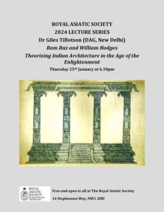 Next Thursday 25 January, 6.30pm, Dr Giles Tillotson will lecture on ‘Ram Raz and William Hodges: Theorizing Indian Architecture’. All are welcome to attend.