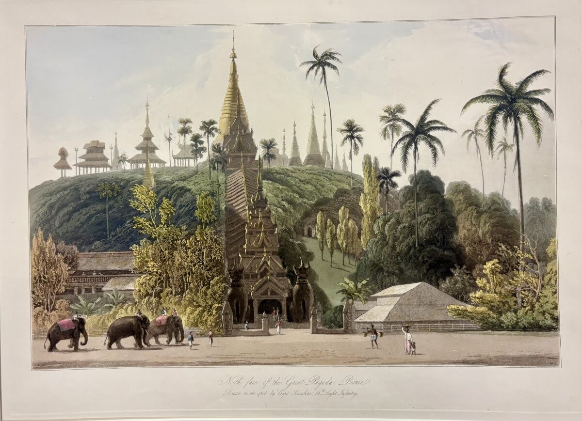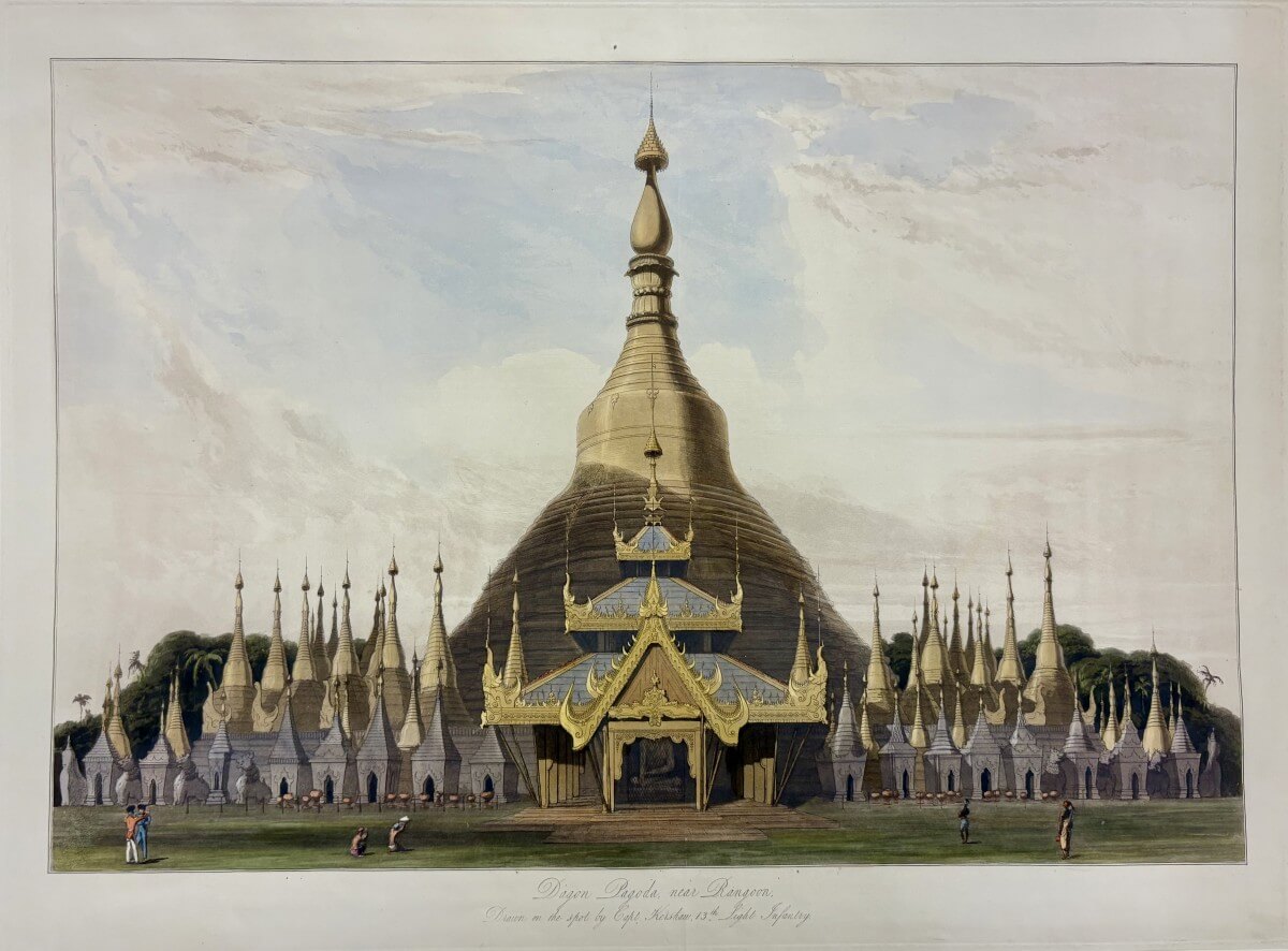 The engravings themselves are of exceptional quality, hand‑aquatinted by artist William Daniell – who was celebrated, alongside his uncle Thomas Daniell, for their picturesque views of India and together designed the Society’s iconic elephant emblem. Kershaw’s selection of subject is entirely topographical and architectural, often featuring the grand structures. Half of the album’s plates depict pagodas or views from pagodas, particularly in Rangoon (Yangon) and Prome (Pyay). Thanks to Daniell’s mastery of tonal aquatint, the images are not only technically accomplished but also deeply atmospheric. They present a highly picturesque – some might even argue romanticised – vision of the Burman Empire, especially poignant given the turbulent aftermath of war.