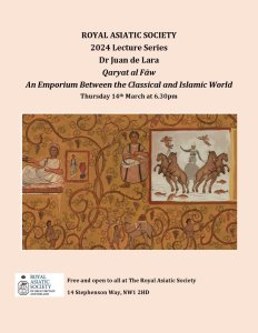 Thursday 14th March, 6.30 pm, Dr Juan de Lara will lecture on Qaryat al Fāw: An Emporium Between the Classical and Islamic World. Qaryat al Fāw, a pre-Islamic site in central Arabia served as a confluence of Arabic and Hellenistic cultures. In his lecture, Juan de Lara will discuss how the art discovered at Qaryat al-Faw served to establish a compelling connection between an urban settlement predating the emergence of Islam, and the art and culture of the first Islamic dynasty of the Umayyads, revealing a continuity in motifs, technique, and styles.